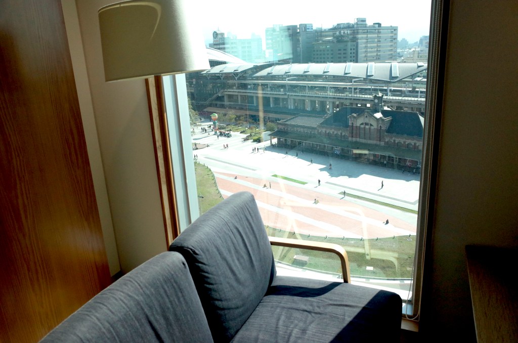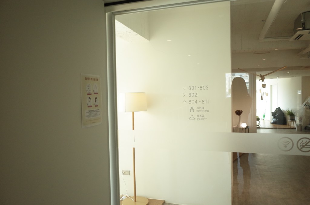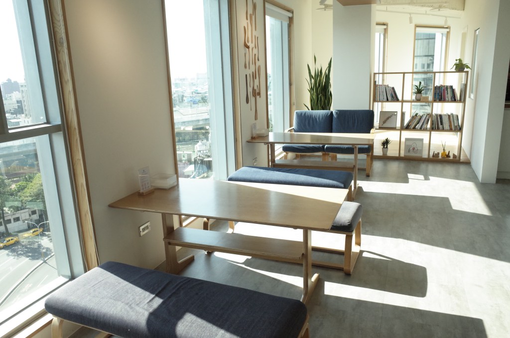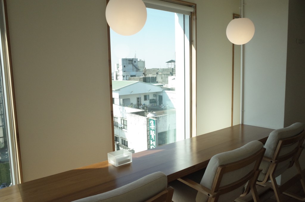 一出電梯可以感受到網路上所說的日系無印風感,空間以木色系和潔白色為主色,大面的窗戶正對台中火車站,陽光從玻璃窗映出影子,空間更顯得溫暖。