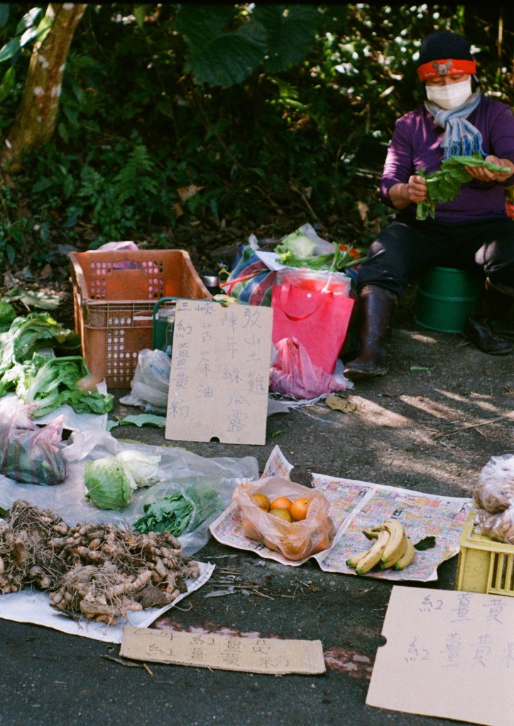 阿姨整理著她今天採收的青菜,除了新鮮蔬果外還賣著陳年絲瓜露、薑黃粉和放山土雞。還沒走到園區入口外面的攤販就吸引我們注目。