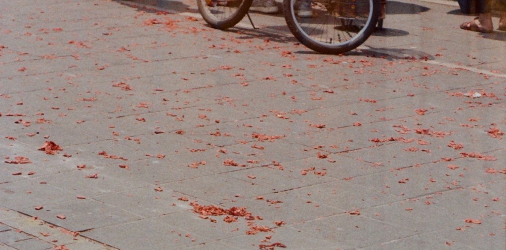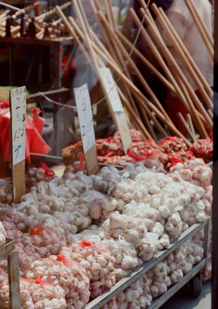 這北港熱鬧街區可以看到地上都是剛放完鞭炮的紅色鞭炮屑,而街上的攤販每走幾步都可看到蒜頭、花生、傳統大餅店或是鴨肉羹等等的地方特色食物。
