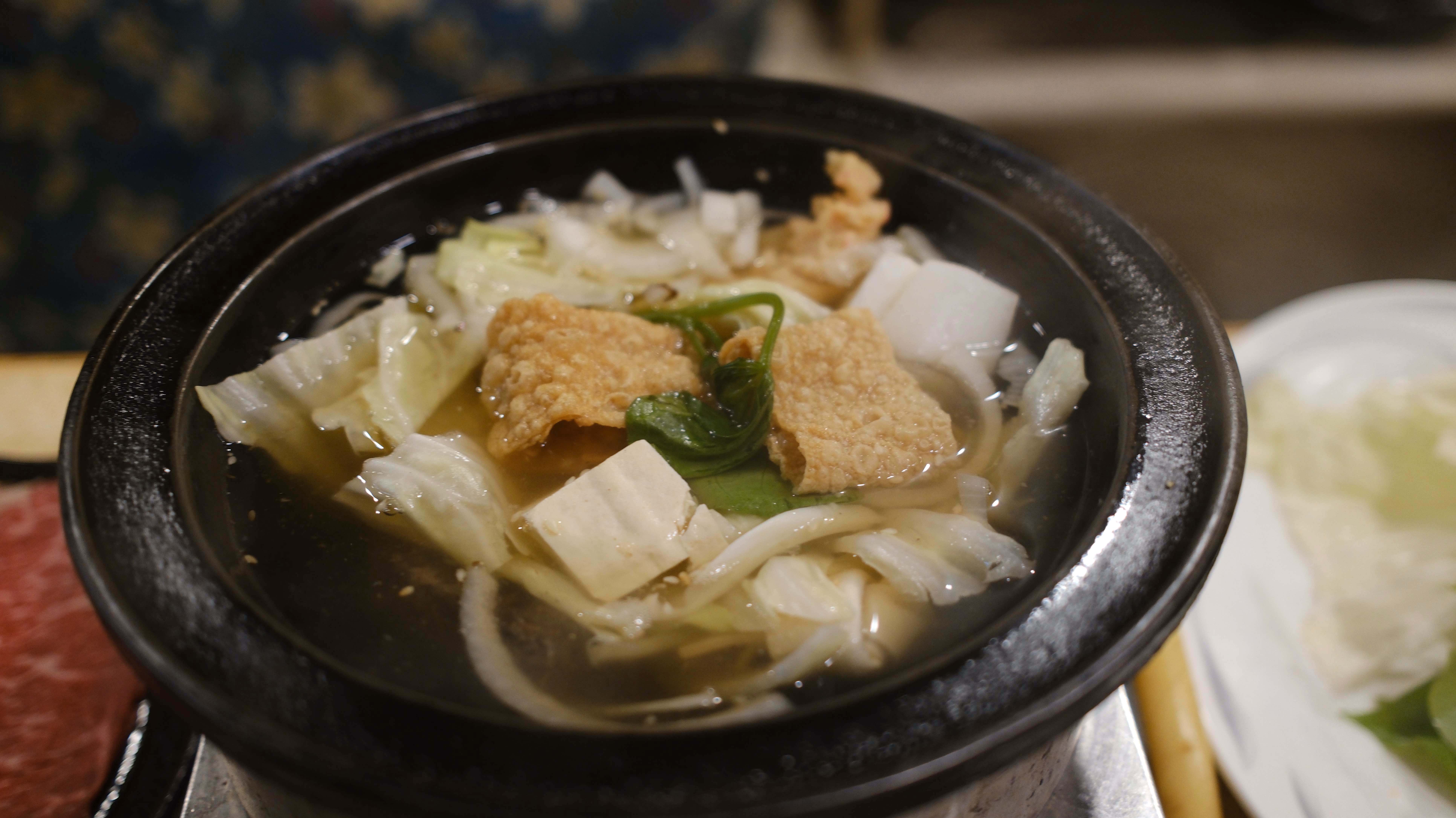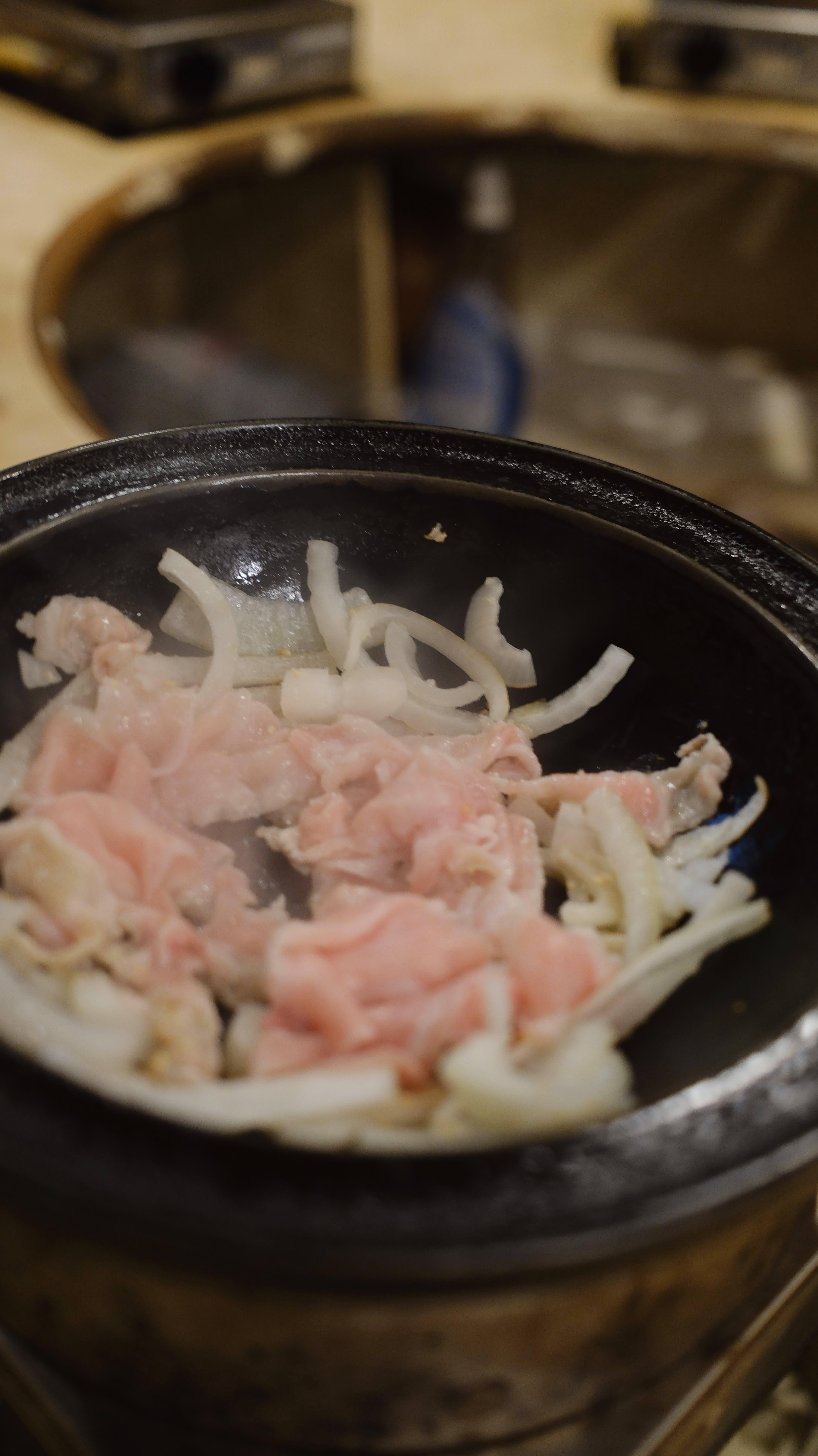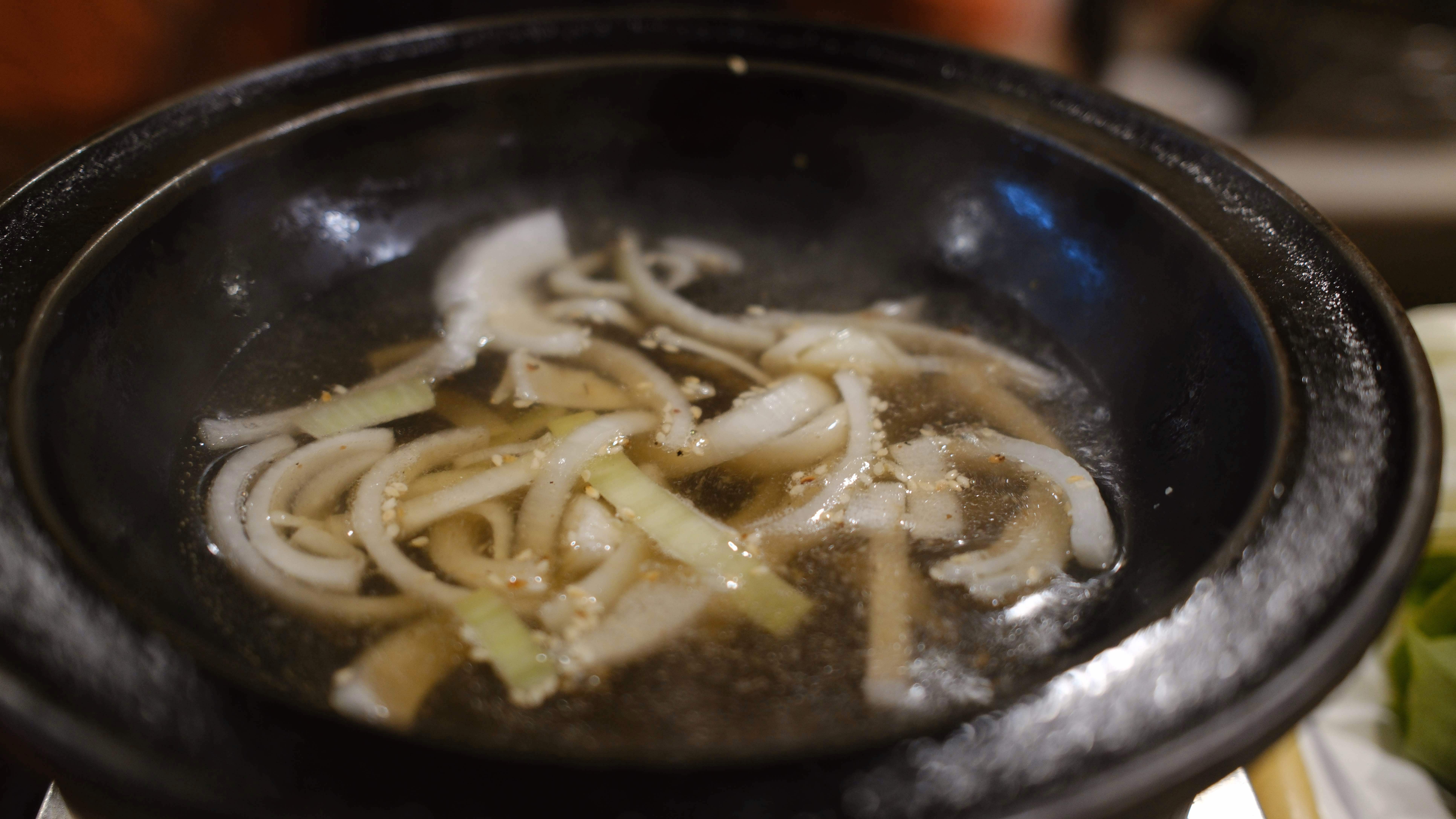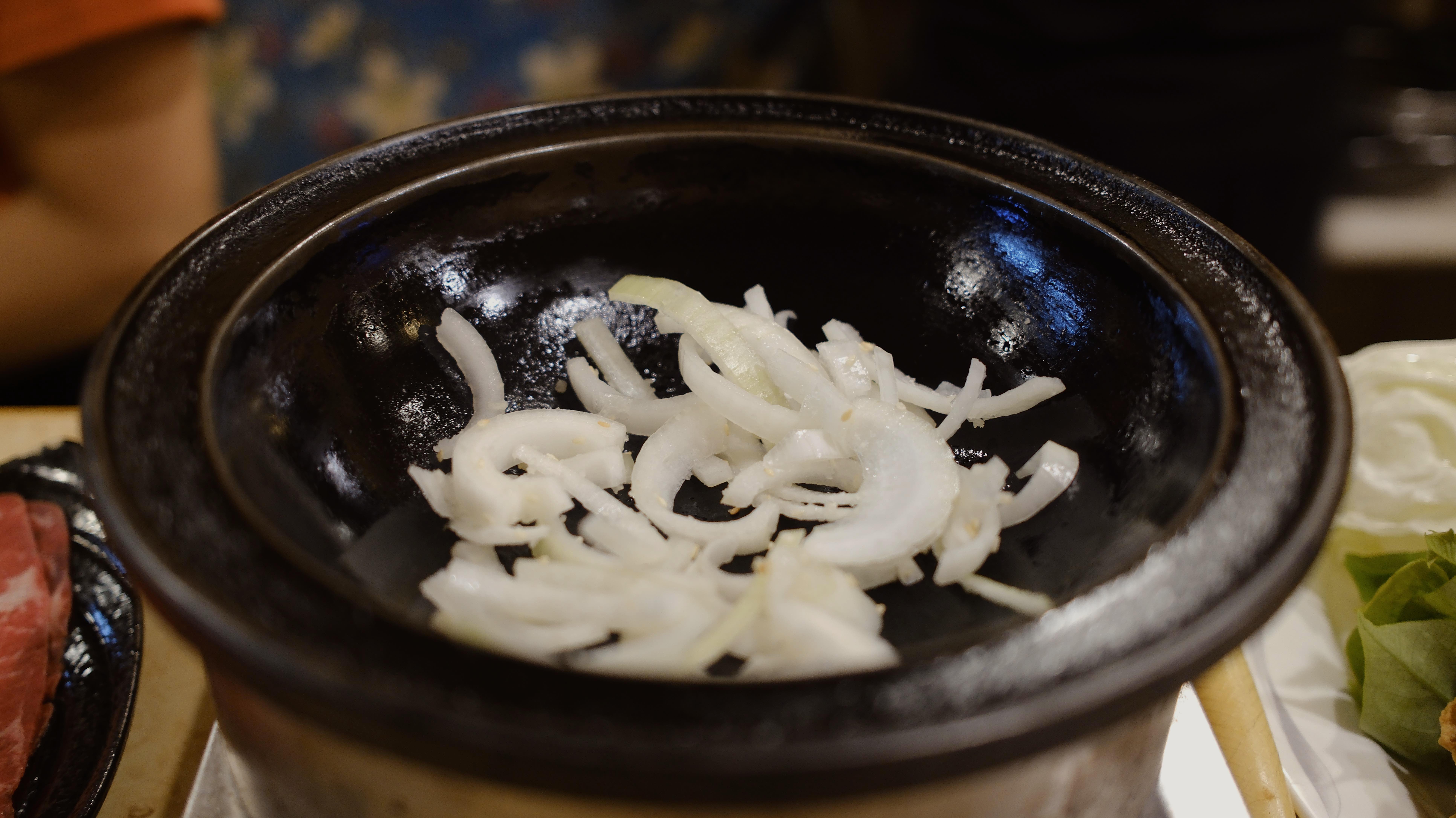 老闆娘先用洋蔥和肉在石頭鍋炒過,再倒入高湯。湯底淡淡的洋蔥香氣、和鹹淡恰到好處的高湯,是我心中最喜歡的石頭火鍋店。