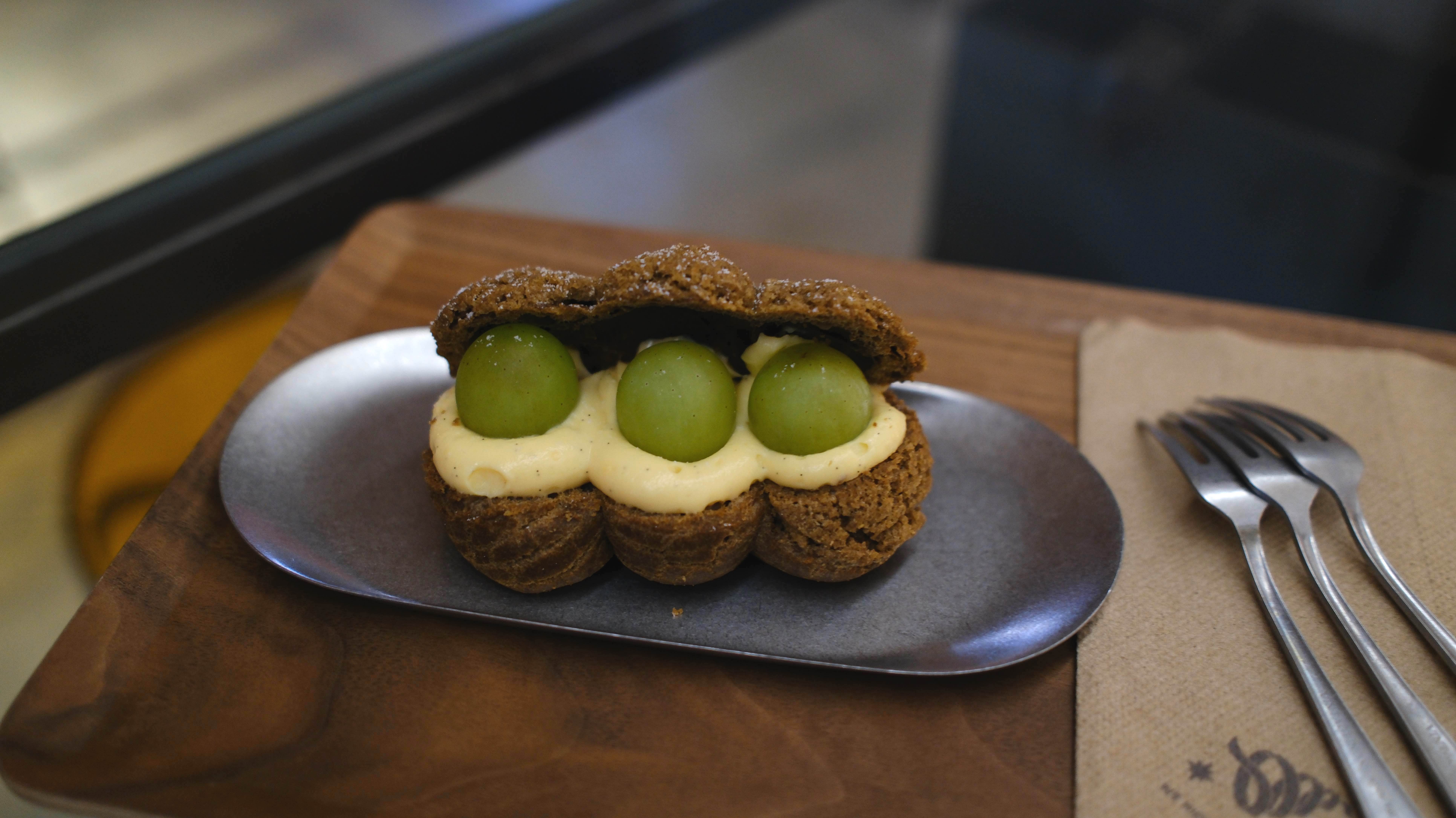酥脆的泡芙外殼、淡淡的茶香味,搭配著卡士達和綠萄葡內餡,不膩的點心。