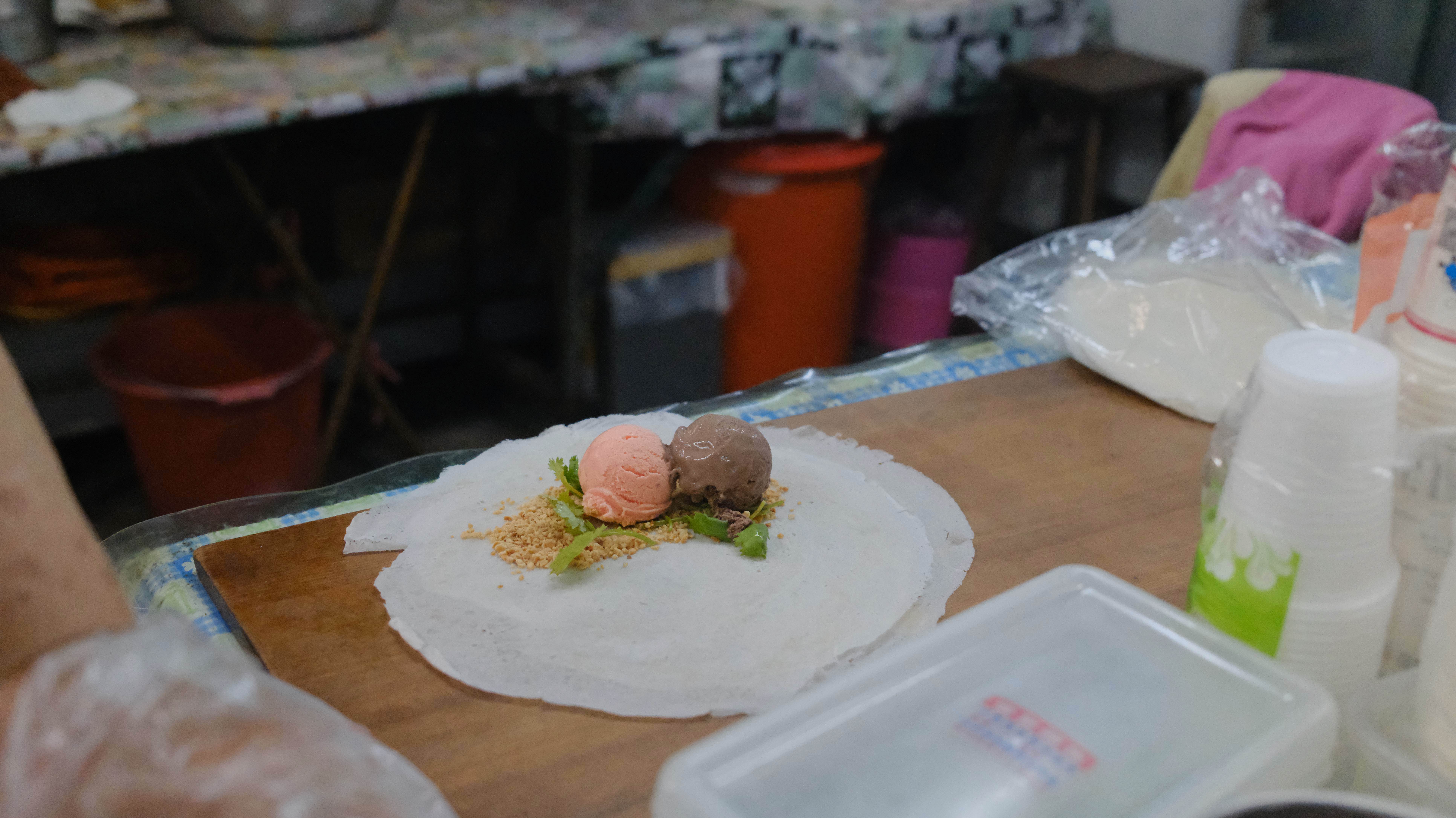 吃完早餐後,熱熱的天氣讓我們忍不住點一份花生捲餅來吃。