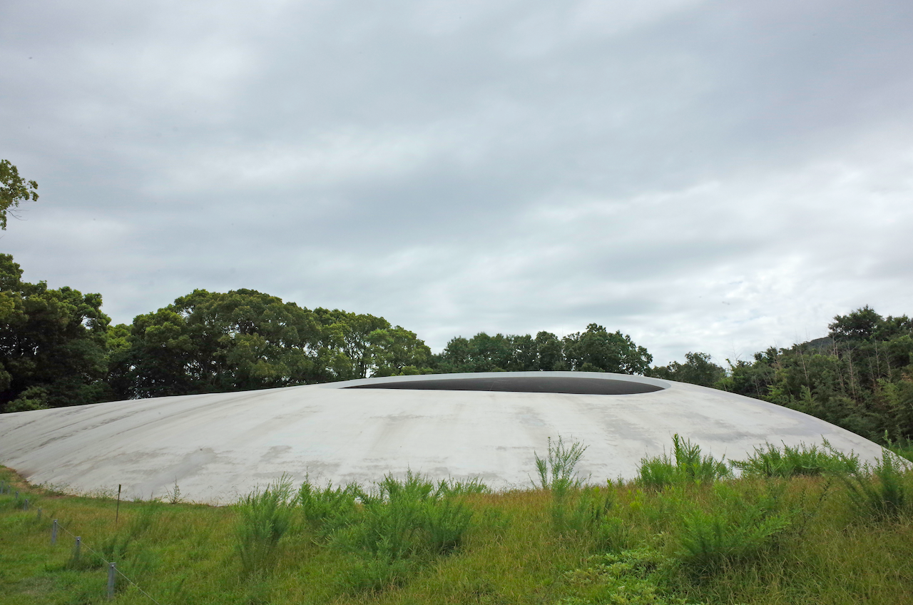 豐島美術館內不能攝影,但美術館就是下面照片巨大橢圓形的樣子,進入美術館內可以看見兩邊的上方開了兩個天窗,一面是樹林景色、另一面是天空景色。