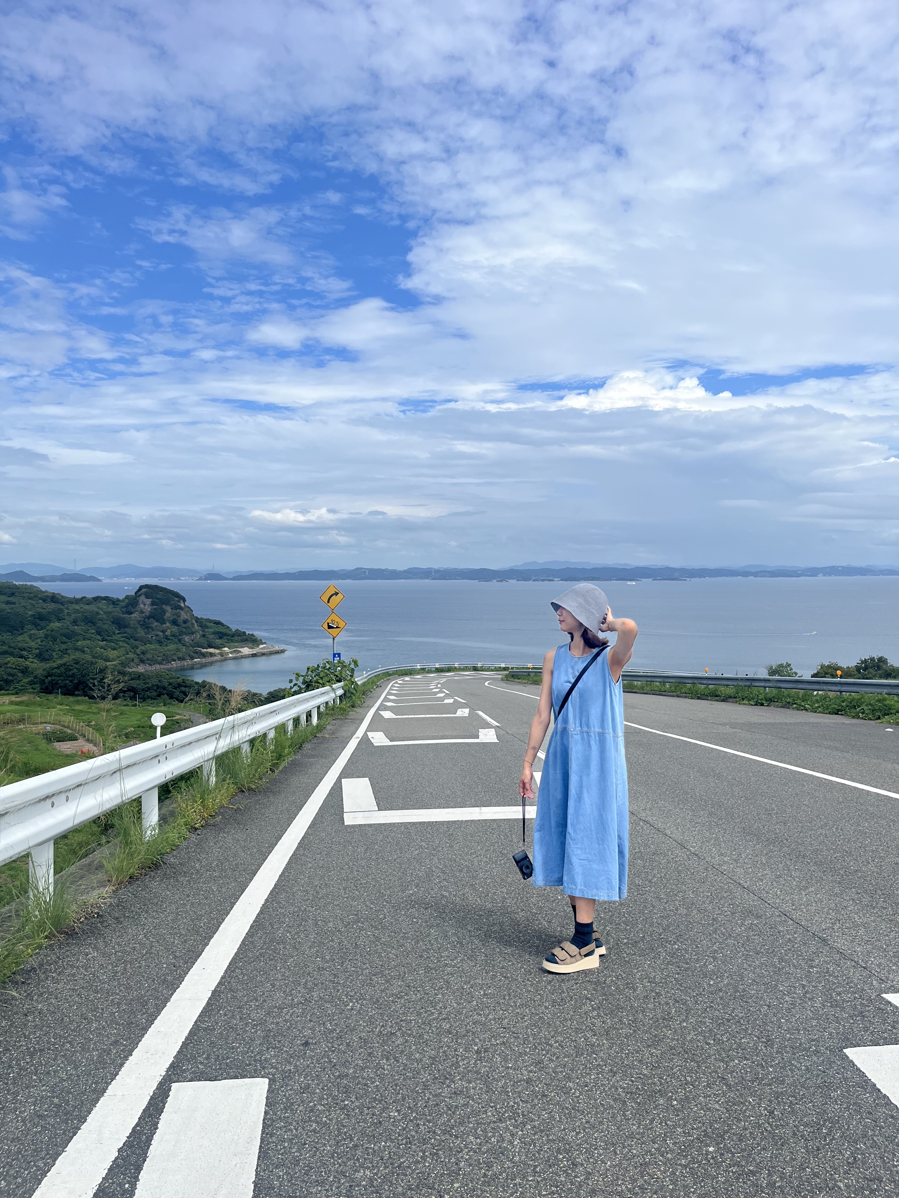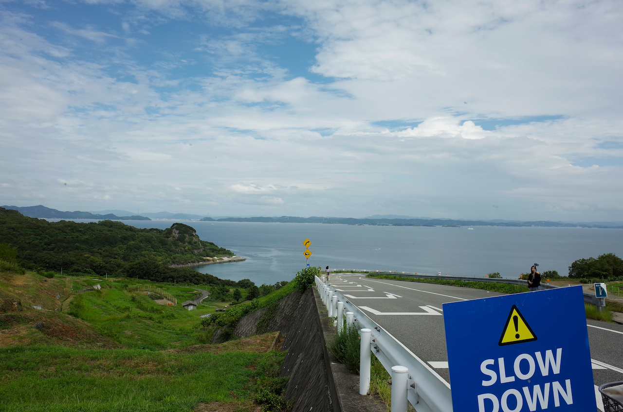 大概騎了20分鐘終於快到豐島美術館,快到豐島美術館會看到眼前一大片的海景,蜿蜒的道路配上這海景,這個景真的好厲害😍 因為平日沒什麼人所以可以在這邊盡情地拍照。