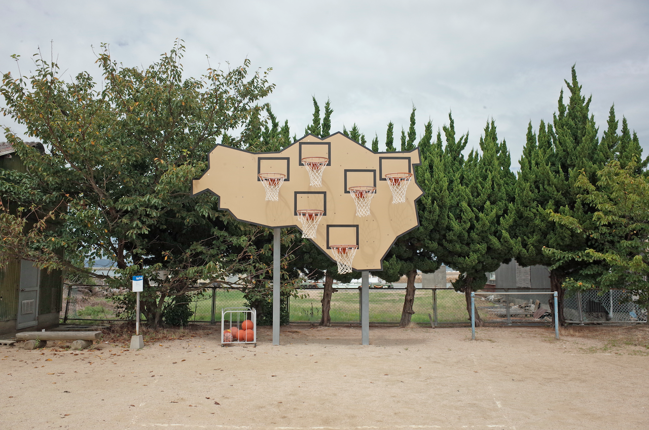 距離雜貨店不到100公尺就會看到無人勝出多重籃框這件作品,以豐島為輪廓的籃板,籃框下還放了籃球讓民眾可以投球。上面有7個籃框,一開始還有另外兩組遊客,我們三組人一起在這盡情的投籃。