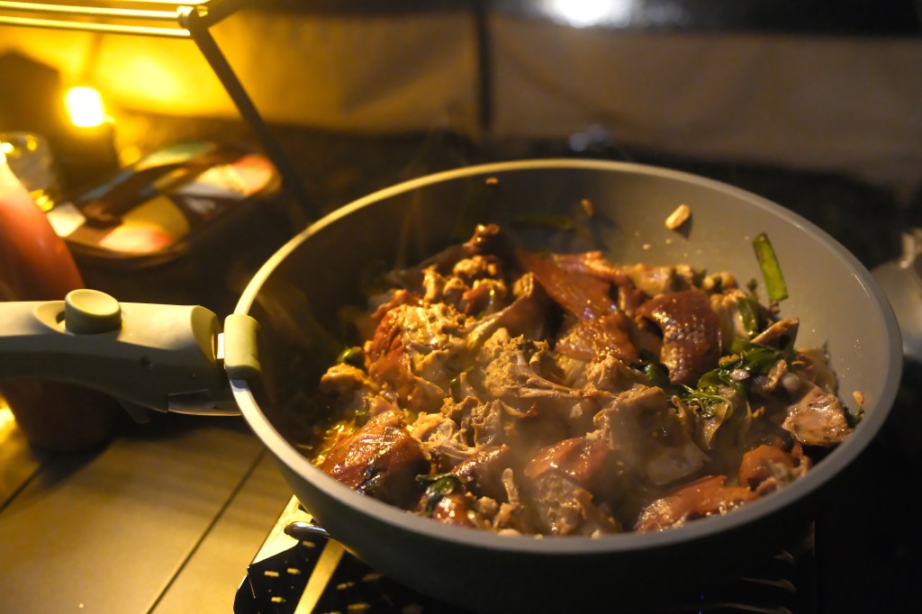 夜衝的那晚在山下買一鴨兩吃,在Google地圖上順著往山上的路途中找到 君首櫻桃鴨創意料理,他們的甜麵醬帶點花生的香氣、不會過鹹、搭配著餅皮和鴨肉片吃,口味超合我們的胃,而且份量和價格也都很合理,在濕冷的夜晚待在帳篷內吃烤鴨,美味程度加分!下山後我們又包一份一鴨三吃帶回去給家人吃。