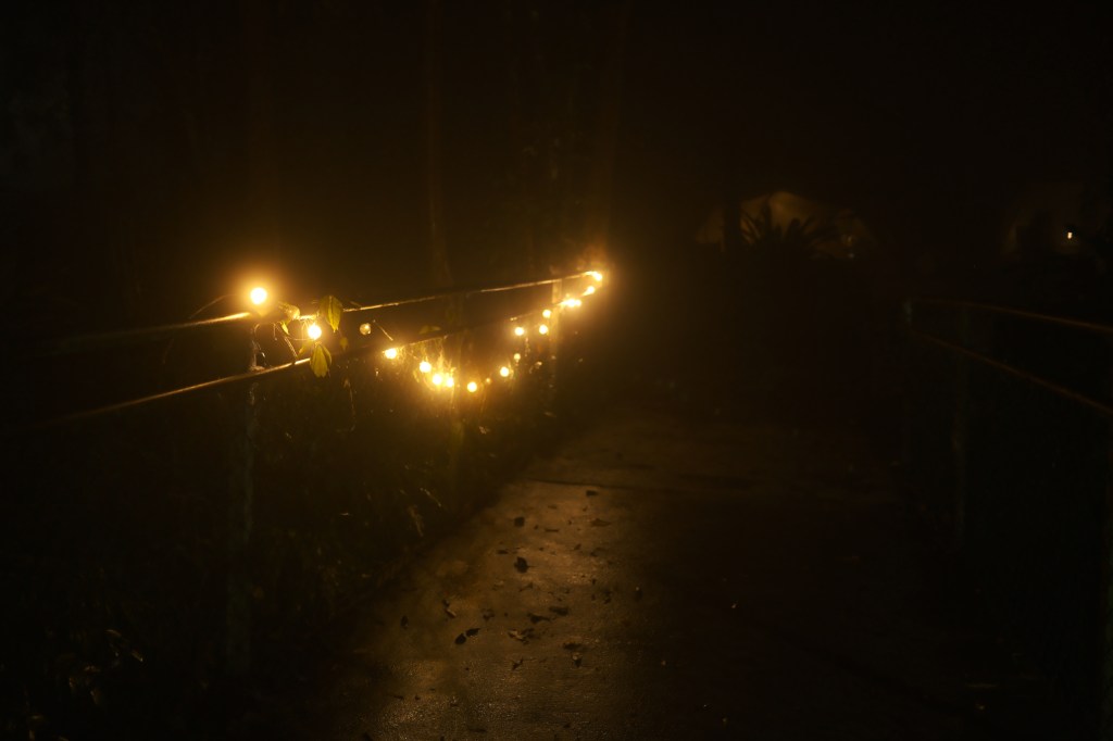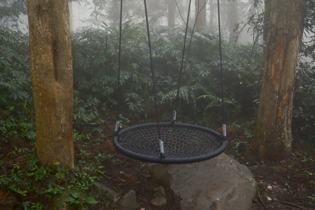 享用完早餐,我在營區內散步。營區周圍樹木繁茂,品種多樣,還有用木頭製成的鞦韆、獨木橋等遊樂器材,完美融入自然中,霧濛濛的景色讓這裡像是仙境。