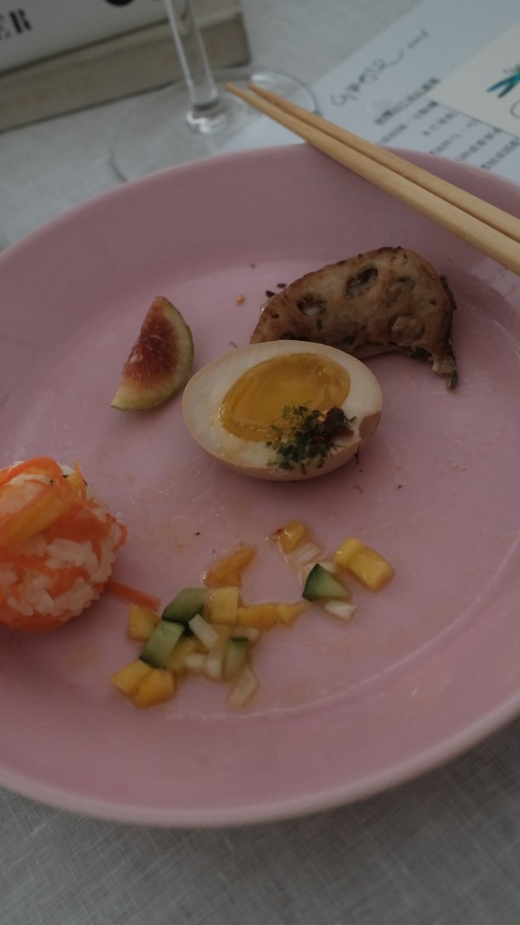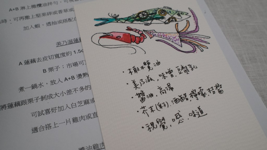 課程開始,每個人桌位都擺著一張用繽紛的色筆繪出食材圖樣小卡,還有一張A4食譜,接著Grace為今天上課的學員一人準備一盤食物,先讓我們品嚐待會要學習烹飪的菜餚。